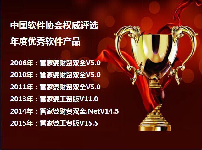 中國軟件行業(yè)協(xié)會舉辦的2015年度軟件產(chǎn)品推優(yōu)評選活動揭曉,經(jīng)過了申報(bào)、技術(shù)資料審核、專家評審等過程,管家婆工貿(mào)版V15.5榜上有名,并榮膺“年度優(yōu)秀軟件產(chǎn)品”稱號。至此,管家婆財(cái)貿(mào)雙全和工貿(mào)版產(chǎn)品已連續(xù)多年獲此殊榮。